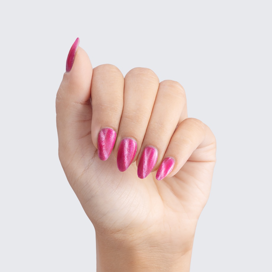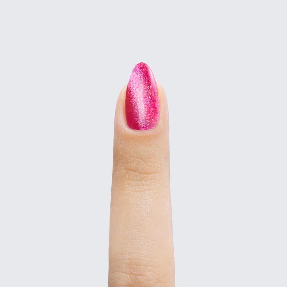 Ruby pink. Medium-dark. Pink magnetic shimmer. Opaque. Cool undertone.