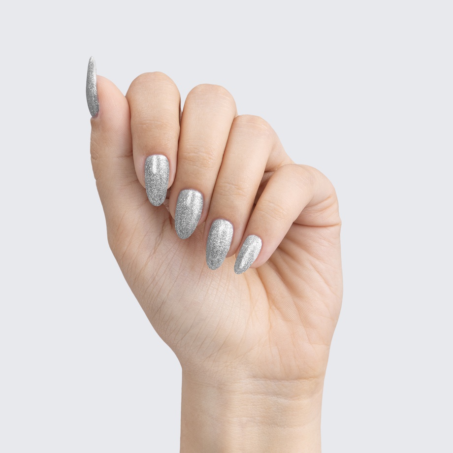 Silver. Metallic foil sparkle. Opaque. Cool undertone.